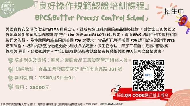 必須具備由美方認可訓練單位所頒發之 BPCS(Better Process Control School)證書。
