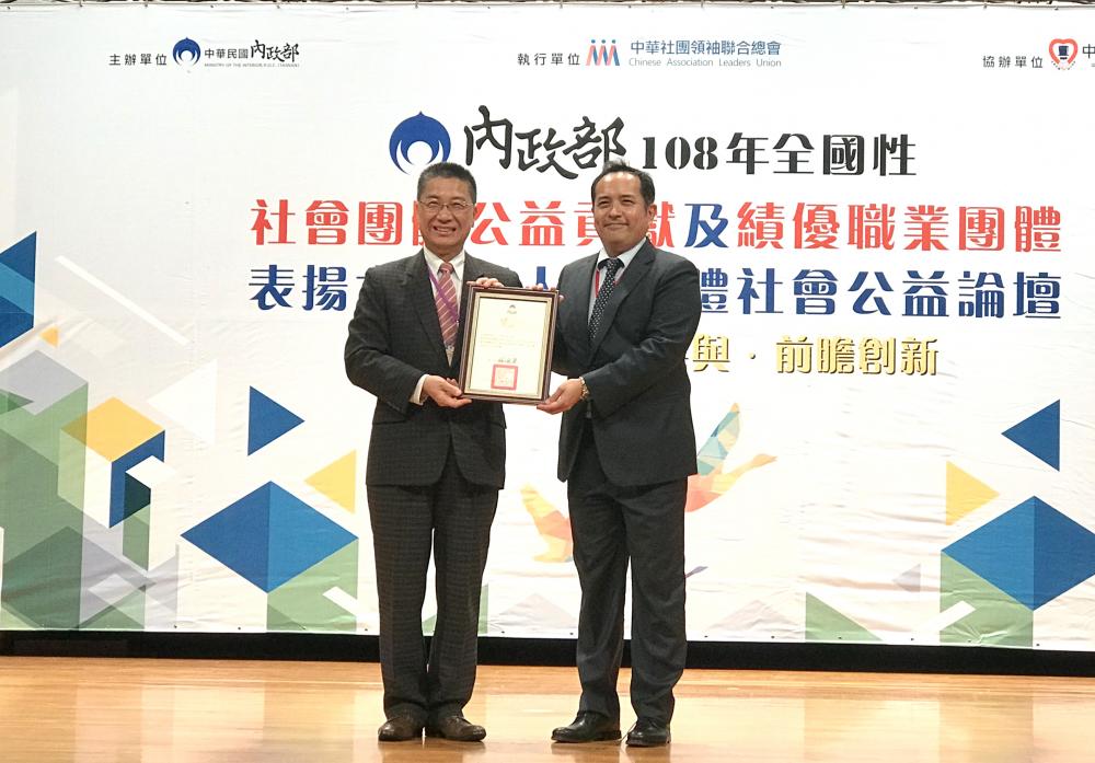 108年度全國性職業團體績效評鑑,本會獲評為優等團體,於108年9月10日由內政部徐國勇部長親頒獎牌,本會陳冠翰理事長授獎。